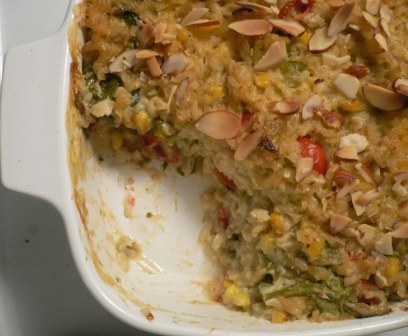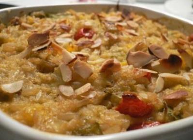 - Transfer the mixture to a baking dish and add the almonds on top.