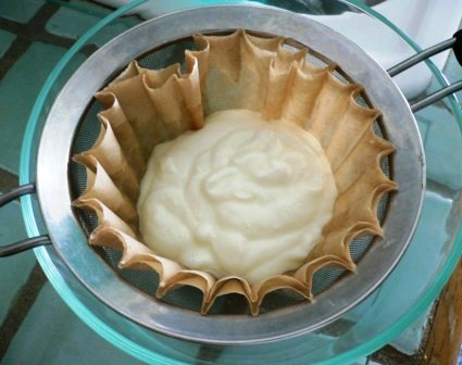 - Empty the salted yogurt onto a fine mesh strainer lined with a cheese cloth or 2 coffee filters. I used the unbleached kind.