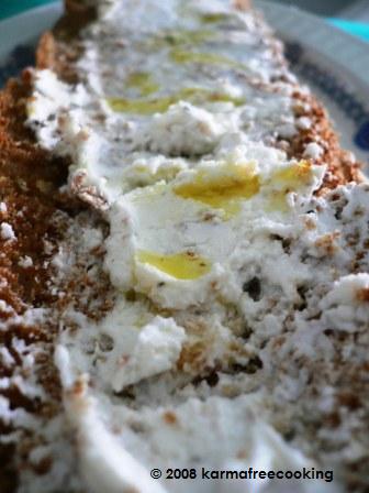 1 whole-wheat baguette 3 oz of soft goat cheese, make sure it’s without animal rennet Extra-virgin olive oil Kosher Salt Freshly-cracked black pepper
