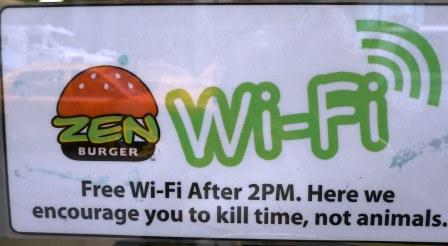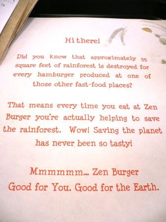 You will find Zen Burger in Mid-town Manhattan on Lexington Ave. between 45th and 46th streets.  It looks like a regular fast food joint, but it is so much different than any fast food joint I have visited, starting from the sign at the door.  Love it…