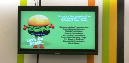 Inside, you can see that everything has an environmental twist to it.  All the napkins are made from 100% recycled materials and the TV screens communicate messages on the advantages to the environment on eating less meat.  Even the tray liners have educational messages.  They are appealing to the environmentalist in all of us… enticing you to eat vegetarian because it’s good to the earth and the environment… the humane part is just a by-product.  I think it’s a good approach.