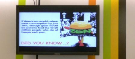 Inside, you can see that everything has an environmental twist to it. All the napkins are made from 100% recycled materials and the TV screens communicate messages on the advantages to the environment on eating less meat. Even the tray liners have educational messages. They are appealing to the environmentalist in all of us… enticing you to eat vegetarian because it’s good to the earth and the environment… the humane part is just a by-product. I think it’s a good approach.