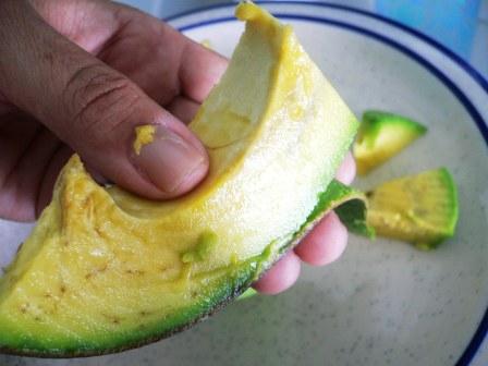 Fuertes are also larger than the Haas, so when we eat avocados in my house, usually we do not eat a whole avocado in one sitting, so we slice the avocado in Rajas, or wedges/slices. That’s the typical way to cut into an avocado here in Puerto Rico. So I will show you how…