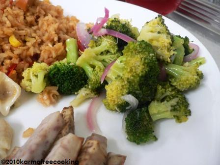 1 head of broccoli florets (save the stems for some other day) 1 small red onion, sliced thin 1 head of garlic, roasted 2 tbs horseradish Juice of 1 lemon Zest of that same lemon Olive oil Salt and Pepper to taste