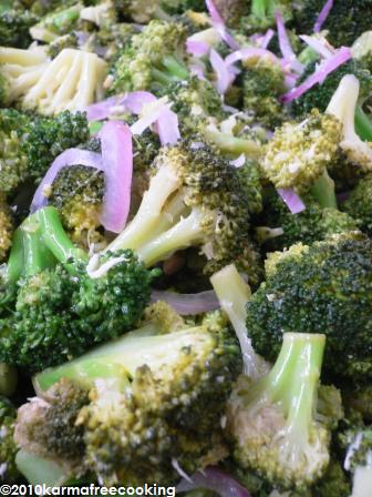 - Now, in a large salad bowl mix together the blanched broccoli that you’ve drained of as much water as possible, the blanched onion slices, the roasted garlic cloves that you’ve removed from the bulb skins, and the lemon/horseradish dressing. Mix all well together to let the broccoli florets absorb as much dressing as possible.