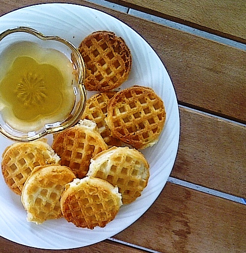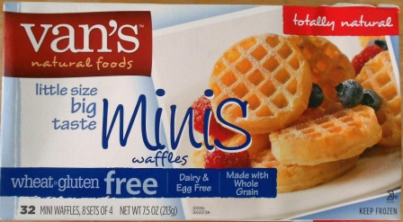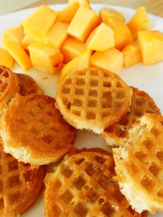 I was impressed at how good they are… they come in regular waffle size and as mini waffles. Love the mini ones because you can eat them with your hands. I dunk them in maple syrup… mmmm!!! Just place them in a toaster oven for about 10 minutes and they’re ready…