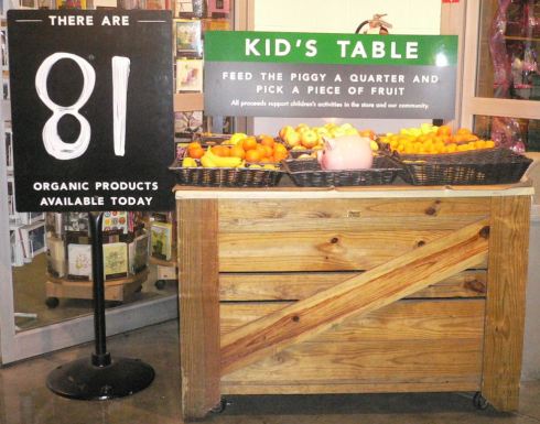 I don’t know if they still do it, but a few years back, they had a table of fruits and kids could just place coins in a piggy bank and serve themselves the fruit they wanted. The funds would support children activities in the store and the community. I didn’t see this table at the Dallas store, but I hope they keep it up.