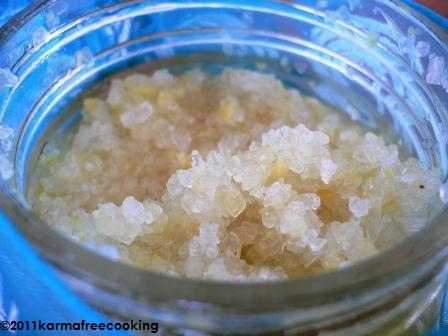 Coarse Sea Salt Bath Oil, unscented preferably (almond or sesame oils are good choices…) the rind of about 4 lemons, cut into small pieces 2 inches of ginger root, peeled and cut into small pieces A plastic jar with tight fitting lid – I used a 16oz recycled jar of peanut butter…