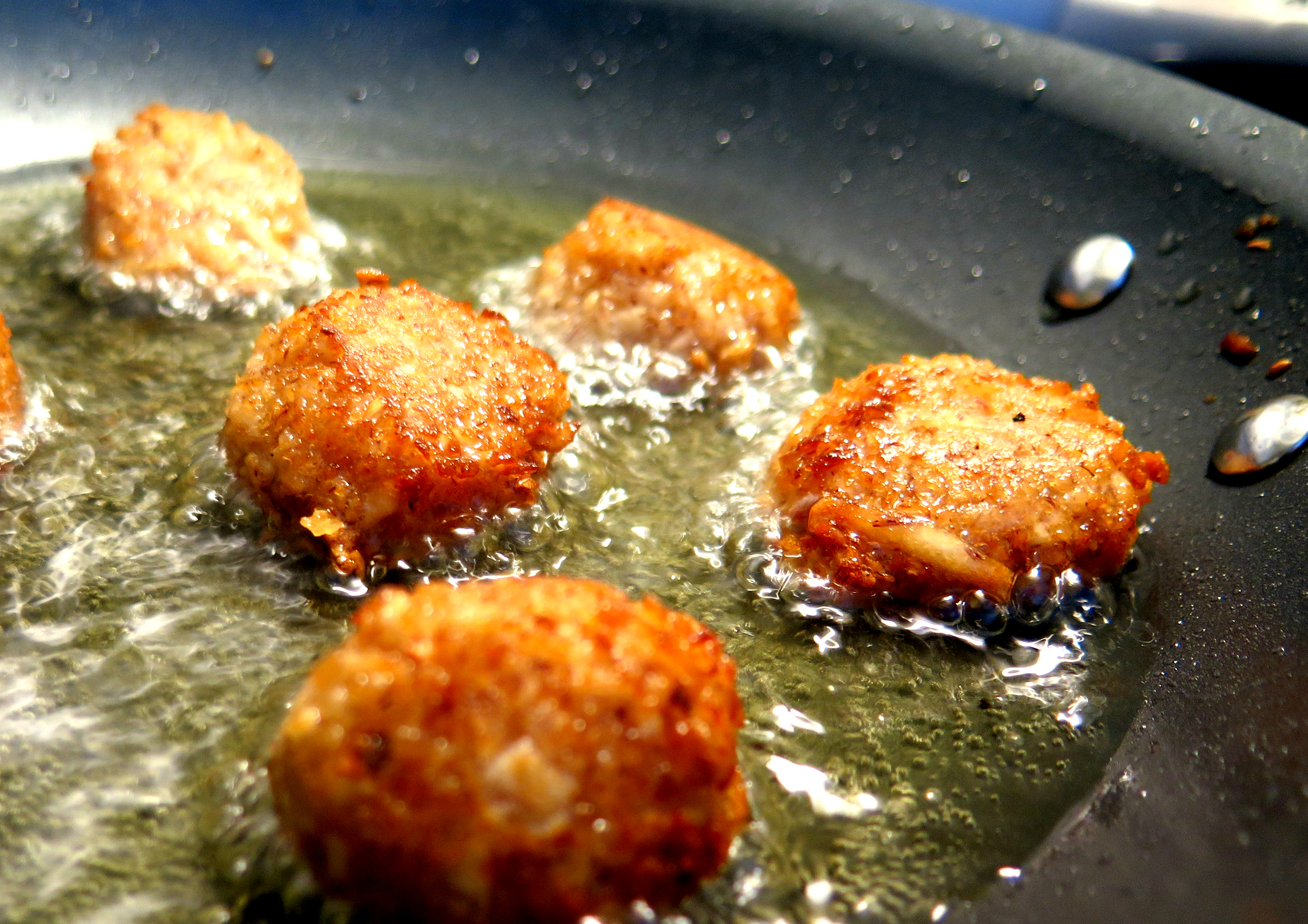 - Using a measuring spoon, measure about 1tbs of masa and create small balls and place in the hot oil. Fry balls on all sides until they’re golden brown. Once the skillet is filled with balls frying, turn down the heat to make sure the inside of the fritter is cooked without burning the outside.
