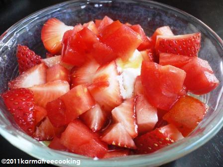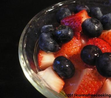 - Just place the fruit in a medium pyrex glass baking dish. Add the apple or orange juice. Sprinkle on top the sugar, cornstarch, lime zest, lime juice and the pinch of salt. Mix well together.