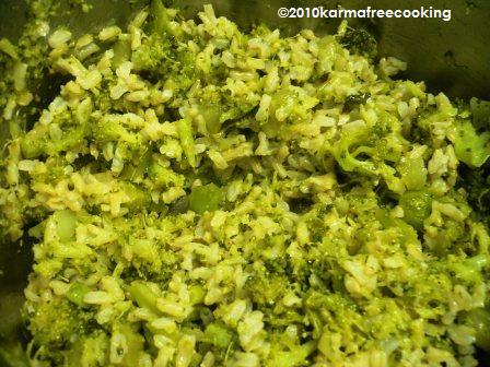 1. In a medium covered skillet with about ¼ cup of water, add the cooked rice and the broccoli florets.  Cover the skillet and over medium heat that bit of water will steam both the rice and the broccoli.   After about 10 minutes, just turn off the stove and the rice and broccoli will be done.