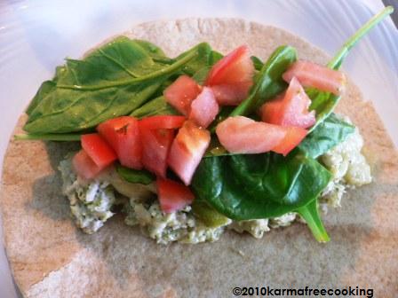 4. Place about ¼ cup of rice on each tortilla/flatbread.  Spread 1tbs of tomatillo salsa over it.  Top with the baby spinach and tomato slices.  Roll up the tortilla/flatbread and wrap in parchment paper before you put any aluminum foil over it.   This way you’ll be able to stick them in the oven to warm up and they’ll stay warm for a while.