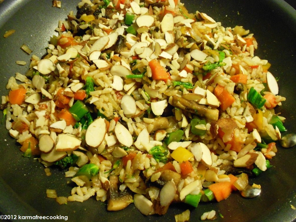 3. Add the cooked rice to the skillet. Mix well and cover again. The steam in the skillet will soften the rice again if it’s hardened from being in the fridge. Allow cooking for a couple of minutes and add the almonds last. Tturn the stove off and leave it there for the residual heat to finish heating the rice, making it fluffy again.
