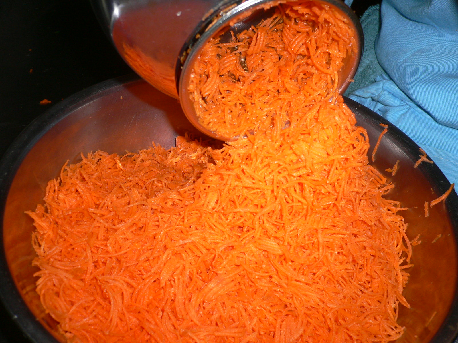 - In a large skillet, cook the grated carrots and sugar, covered for about 20 minutes.