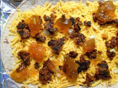 - Start mounting the fillings… spread most of the apricot jam on the bottom half of your quesadilla. Add the cheese, the crumbled cooked soyrizo, the scallions and a tad bit additional apricot jam if you wish. Fold the tortilla to create a half moon. Press it lightly to make it all “stick together”.