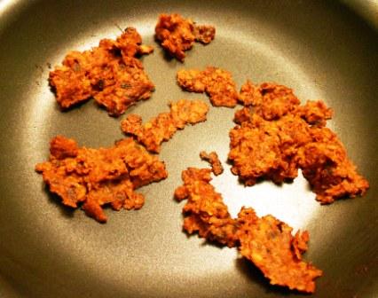 - In a small non-stick skillet over medium high heat, with a tad bit of olive oil, cook the soyrizo. Start moving it around allowing it to brown on one side before mixing it up and moving it around. It will cook and brown until it turns into crumbles. Set aside.