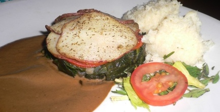 Portobello Stack – a Portobello mushroom cap filled with sautéed spinach and topped with slices of red potato.  It was served with gravy and a side of “smashed” cauliflower.