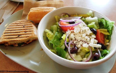 Caprese Panini with Tomato, Mozzarella and Basil pressed in a baguette with a Greek Salad