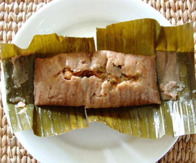 - Take a large cooking spoon and spoon about a spoonful of masa in the center of the banana leaf. Using the spoon, form a well in the center of the mixture and place about 2 tablespoons of the soy/vegetable mixture in the well. Carefully fold the leaf over, in order to cover the filling with masa on all sides. DO NOT over stuff them.