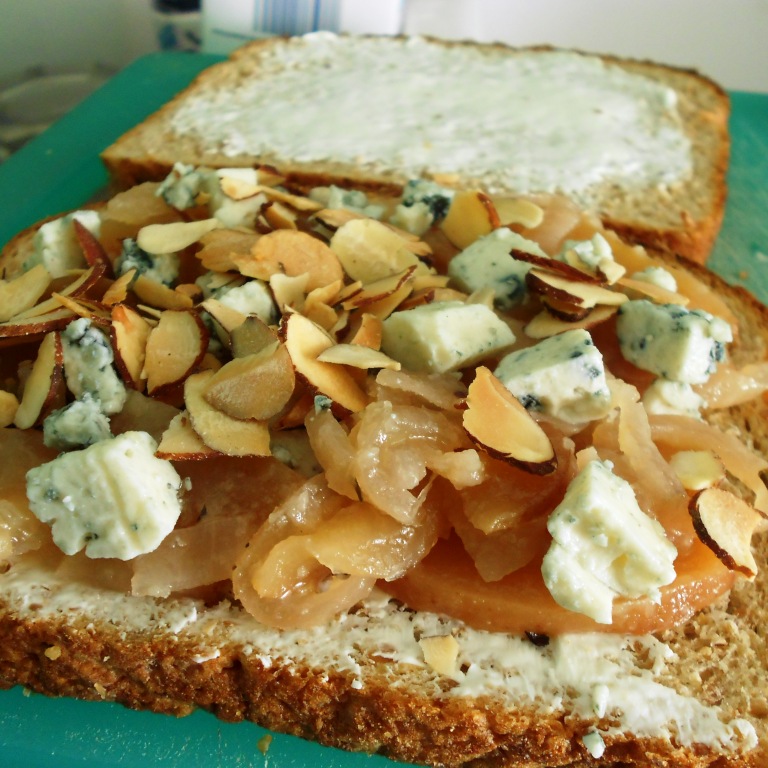 But recently I have come to learn to love another sandwich… maybe not as fresh-tasting as the one above, but certainly very seasonal. Mixing apples, onions, thyme, almonds and blue cheese in between 2 pieces of bread might not seem very appealing, but oh, oh boy, how delicious it is. This has nothing to do with my Latin roots, but everything that I have learned to appreciate from my travels in the Northeastern part of the US.