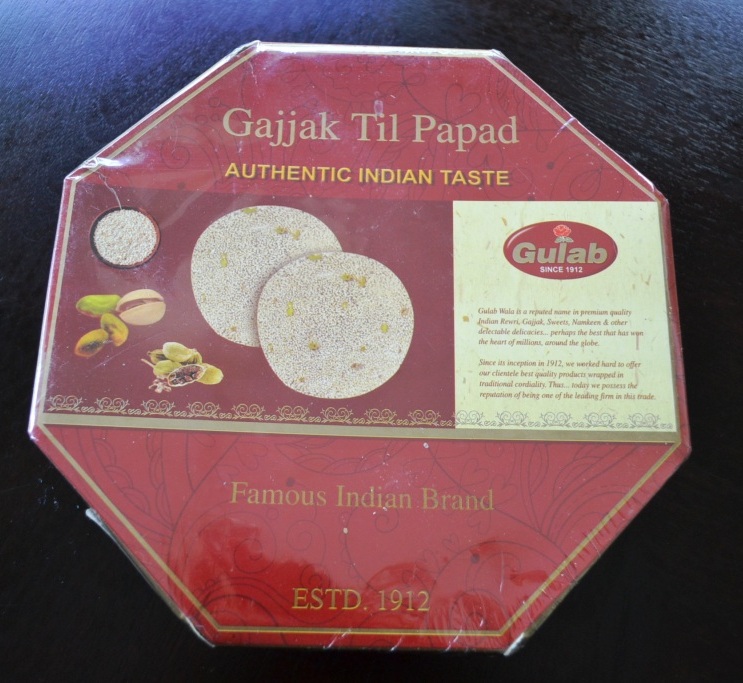As soon as we arrived in India, we were gifted a backpack filled with Indian goodies: a sari for the girls and a dhoti for the guys, a towel that looks like a very nice kitchen towel and these… Gajjak Til Papad. The best way I can describe it is this is the Indian version of a sesame seed brittle. Super duper thin sheet of sugar with sesame seeds, pistachios and flavored with cardamom. We ate one box along the trip… this was our in-room snack, we brought one box for my sister and I have an extra one with me in Puerto Rico. It’s in the fridge for the sugar to be hard and crispy like we ate them in India and not softy and chewy.