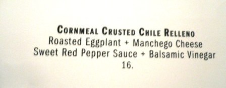 I am seeking MESA GRILL the next time I travel to NYC… I certainly did not expect to eat as well as I did. I am always skeptical of places with lots of hype… And the server, when I mentioned I was vegetarian, went out of his way to point out what I could order and what I should stay away. During my next visit, I want to order the Chiles Rellenos filled with Roasted Eggplant and Manchego Cheese, part of the Entrée part of the Menu, and they sound especially appetizing – kind of like Mexico and Spain meeting in the middle.