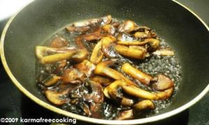 1.  In a large skillet over medium high heat, heat up the butter and oil.  When the butter/oil is very hot, add the sliced mushrooms.  Toss a bit so the mushrooms are coated with the oil mixture on most sides.  But don’t toss them continually; allow them to get brownish on one side for a few minutes before moving them again.  Add the thyme.