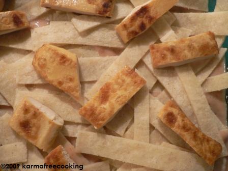 I had a bunch of tortillas I had bought to experiment with a few Mexican dishes I learned in Mexico and got tired of seeing them in the fridge, so I searched several recipes and found a few interesting ones, but of course all included some kind of meat.  I had some left-over tofu-chón in my fridge and I decided to mix and match recipes to see what would work.
