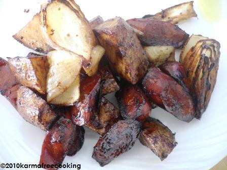 3. Roast in oven for about 40-45 minutes.  I move things around about halfway thru cooking to make sure everything gets golden brown on all sides.