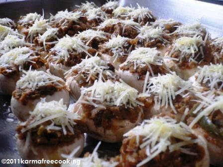 I didn’t want to cook something and have it re-heated… I though stuffed mushrooms would be perfect because I could stuff them at home and cook them in batches as people would visit and decided they wanted something to nibble on.