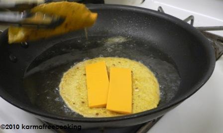 - In a large skillet, add about ¼” of oil at medium-high heat… when the oil is hot enough for frying, add a tortilla and fry slightly on both sides. Immediately, add two slices of cheese on one half of the tortilla and fold the other half over to create a half moon. Fry on both sides until the tortilla is slightly golden brown and the cheese has melted.