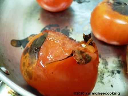 - In a non-stick skillet, place the tomatoes and roast them on top of the stove at medium-high heat. Keep moving the tomatoes around to char the skin all over. This will cook slightly the tomato flesh and impart a great smoky taste to the salsa.